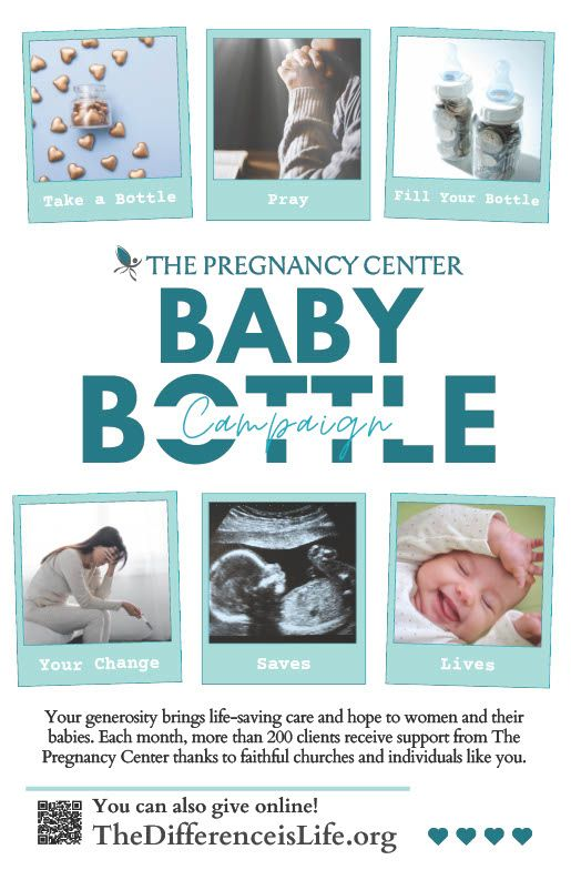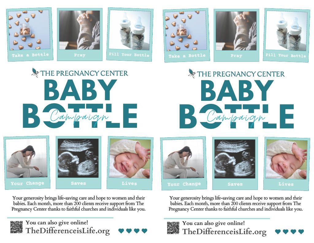 It's Baby Bottle Time! The Baby Bottle Campaign is a simple yet powerful way to support women and families facing unplanned pregnancies. By filling a baby bottle with change, cash, or checks—or donating online—you help provide free, life-affirming services to those in need. Click to learn more and use our free resources!